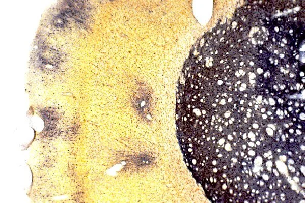 The spinal cord section stained with NDT208 FD Luxol Fast Blue Solution.